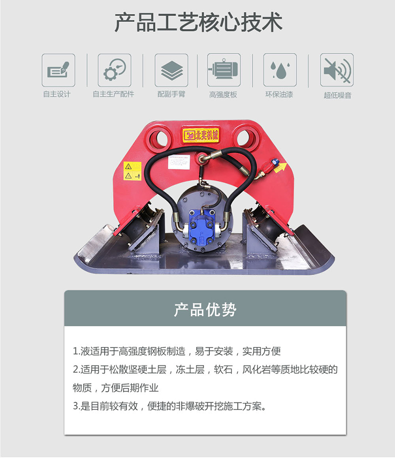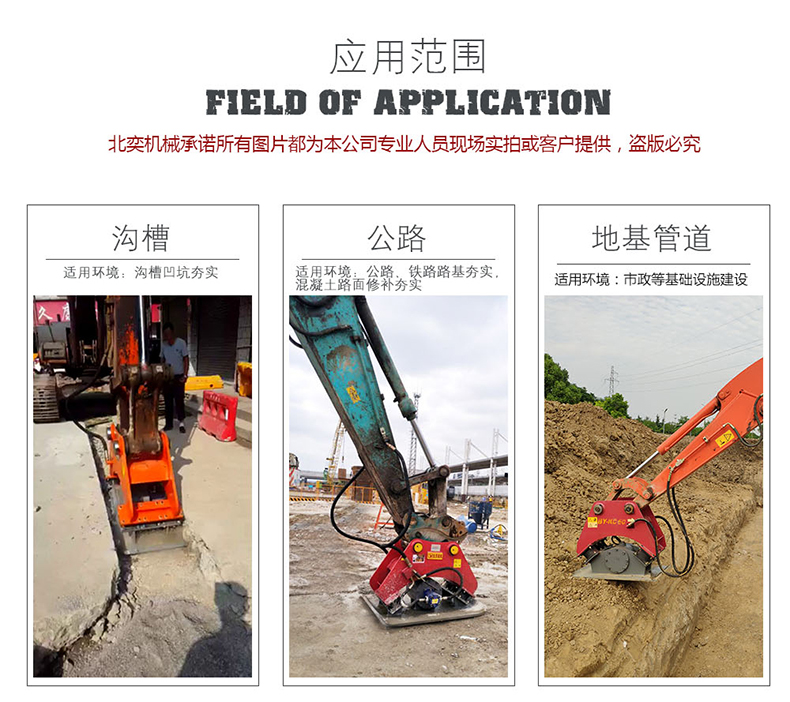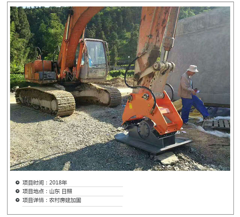 液压振动夯实机除激振力明显大于振动平板夯外,突出特点是振幅大,为振动平板夯的十余倍至数十倍,具有冲击压实效能,填层厚度大,压实度可达到高速公路等高等级基础的要求,可与振动压路机配套使用,处理边角、桥台背等。